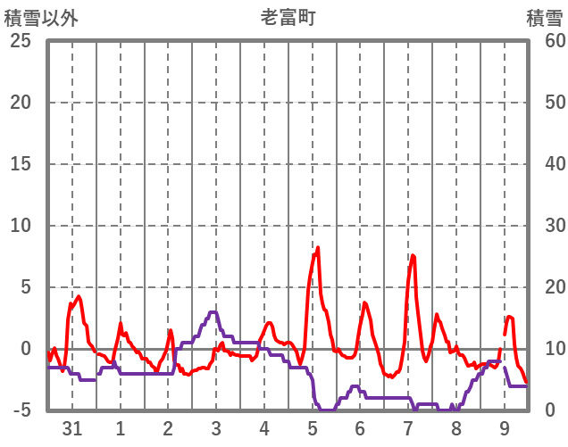 | 日 | 時 | 気温 | 降水 | 風向/風速 | 日照 | 積雪 | 降雪 |