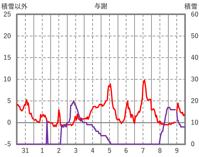 | 日 | 時 | 気温 | 降水 | 風向/風速 | 日照 | 積雪 | 降雪 |