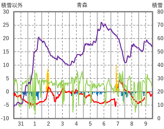 | 日 | 時 | 気温 | 降水 | 風向/風速 | 日照 | 積雪 | 降雪 |