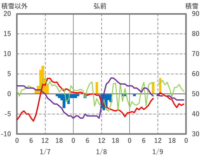 | 日 | 時 | 気温 | 降水 | 風向/風速 | 日照 | 積雪 | 降雪 |