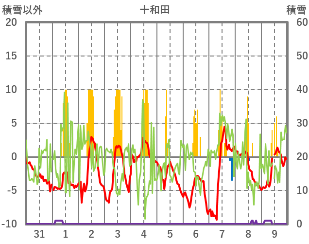 | 日 | 時 | 気温 | 降水 | 風向/風速 | 日照 | 積雪 | 降雪 |