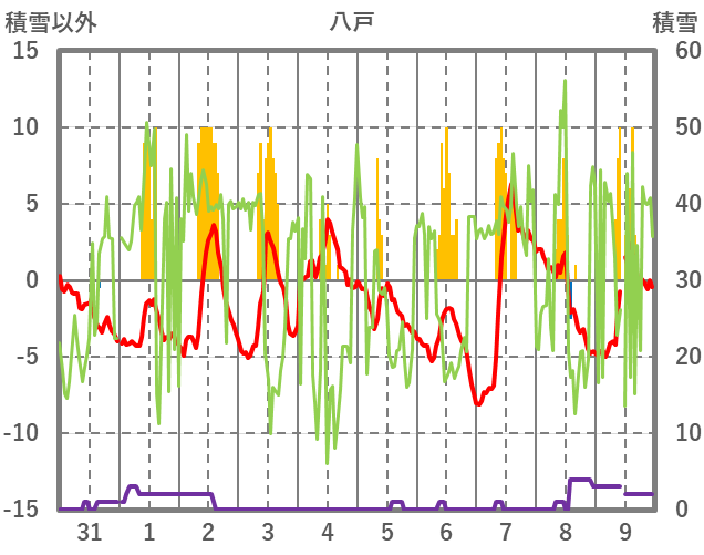| 日 | 時 | 気温 | 降水 | 風向/風速 | 日照 | 積雪 | 降雪 |