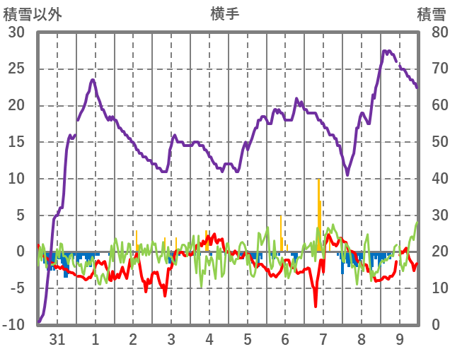 | 日 | 時 | 気温 | 降水 | 風向/風速 | 日照 | 積雪 | 降雪 |