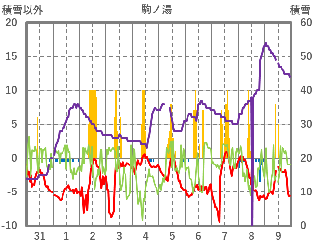 | 日 | 時 | 気温 | 降水 | 風向/風速 | 日照 | 積雪 | 降雪 |