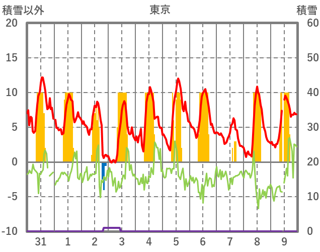 | 日 | 時 | 気温 | 降水 | 風向/風速 | 日照 | 積雪 | 降雪 |