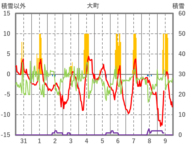 | 日 | 時 | 気温 | 降水 | 風向/風速 | 日照 | 積雪 | 降雪 |
