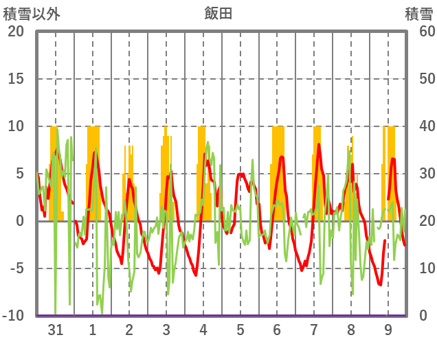 | 日 | 時 | 気温 | 降水 | 風向/風速 | 日照 | 積雪 | 降雪 |