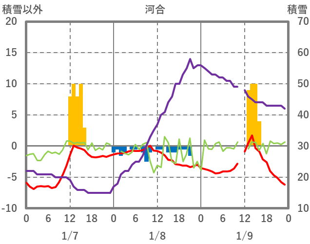 | 日 | 時 | 気温 | 降水 | 風向/風速 | 日照 | 積雪 | 降雪 |