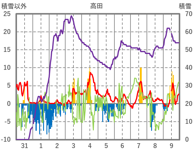 | 日 | 時 | 気温 | 降水 | 風向/風速 | 日照 | 積雪 | 降雪 |
