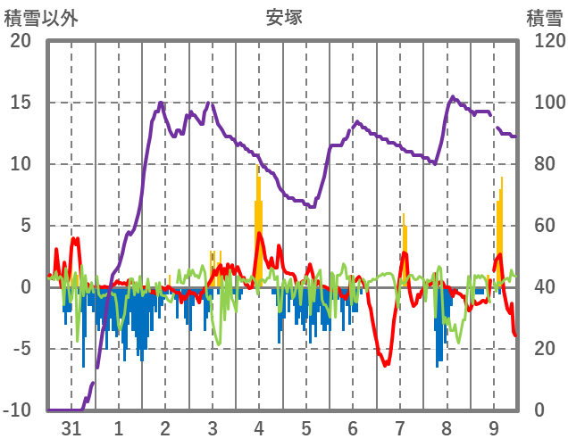 | 日 | 時 | 気温 | 降水 | 風向/風速 | 日照 | 積雪 | 降雪 |