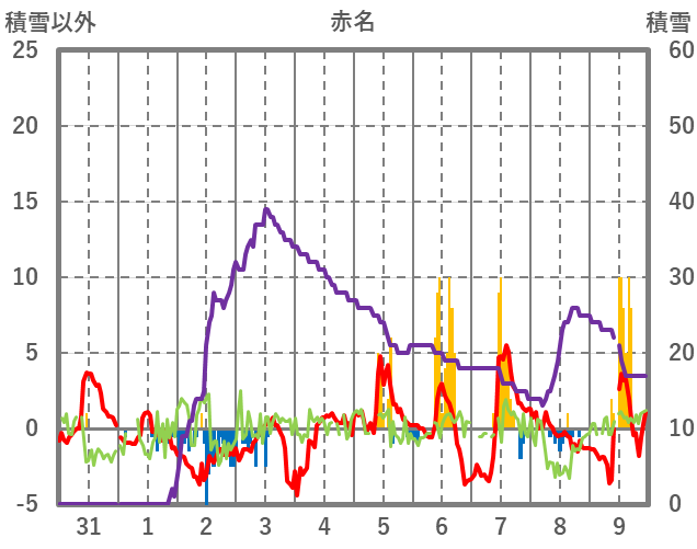 | 日 | 時 | 気温 | 降水 | 風向/風速 | 日照 | 積雪 | 降雪 |