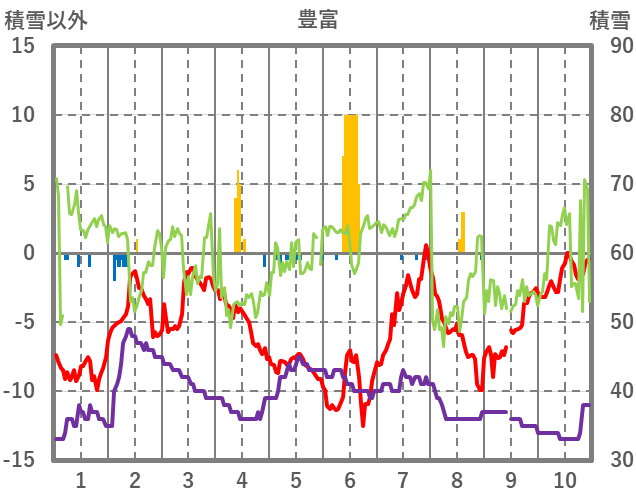 | 日 | 時 | 気温 | 降水 | 風向/風速 | 日照 | 積雪 | 降雪 |