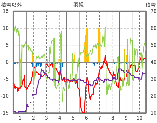 | 日 | 時 | 気温 | 降水 | 風向/風速 | 日照 | 積雪 | 降雪 |