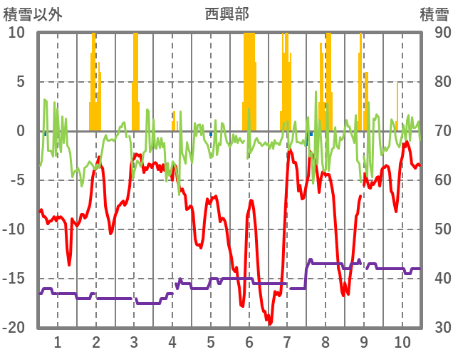 | 日 | 時 | 気温 | 降水 | 風向/風速 | 日照 | 積雪 | 降雪 |