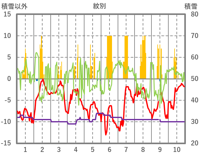 | 日 | 時 | 気温 | 降水 | 風向/風速 | 日照 | 積雪 | 降雪 |