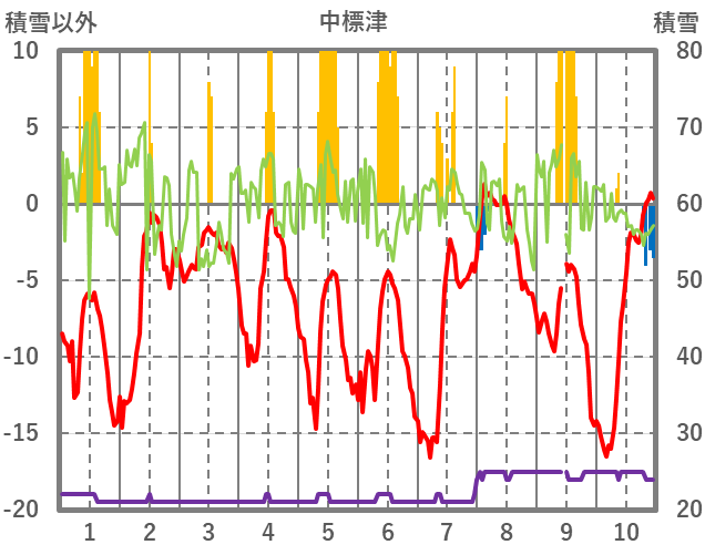 | 日 | 時 | 気温 | 降水 | 風向/風速 | 日照 | 積雪 | 降雪 |