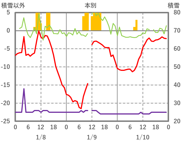 | 日 | 時 | 気温 | 降水 | 風向/風速 | 日照 | 積雪 | 降雪 |
