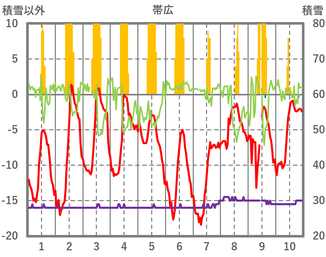 | 日 | 時 | 気温 | 降水 | 風向/風速 | 日照 | 積雪 | 降雪 |