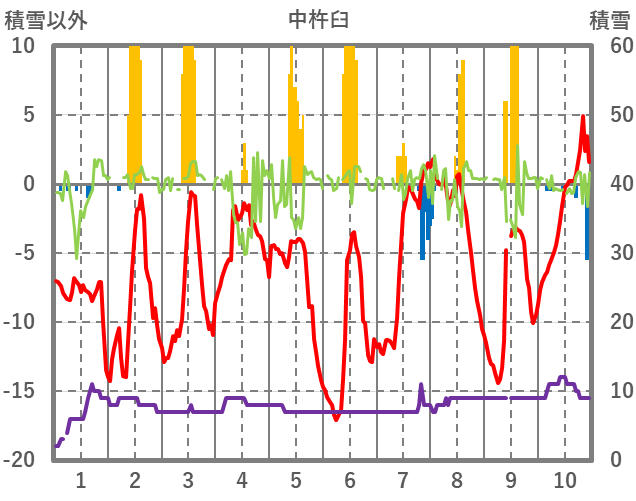 | 日 | 時 | 気温 | 降水 | 風向/風速 | 日照 | 積雪 | 降雪 |