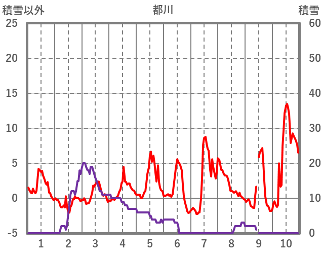 | 日 | 時 | 気温 | 降水 | 風向/風速 | 日照 | 積雪 | 降雪 |