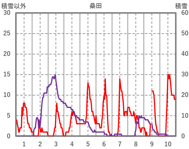 | 日 | 時 | 気温 | 降水 | 風向/風速 | 日照 | 積雪 | 降雪 |