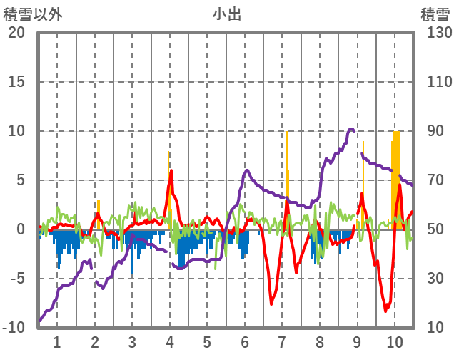 | 日 | 時 | 気温 | 降水 | 風向/風速 | 日照 | 積雪 | 降雪 |