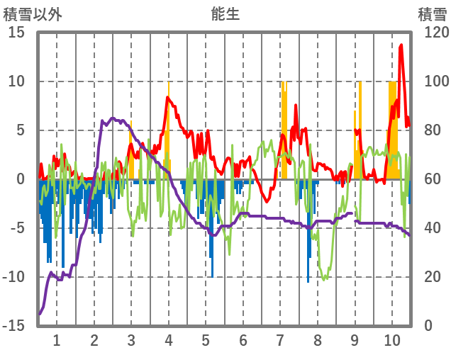 | 日 | 時 | 気温 | 降水 | 風向/風速 | 日照 | 積雪 | 降雪 |