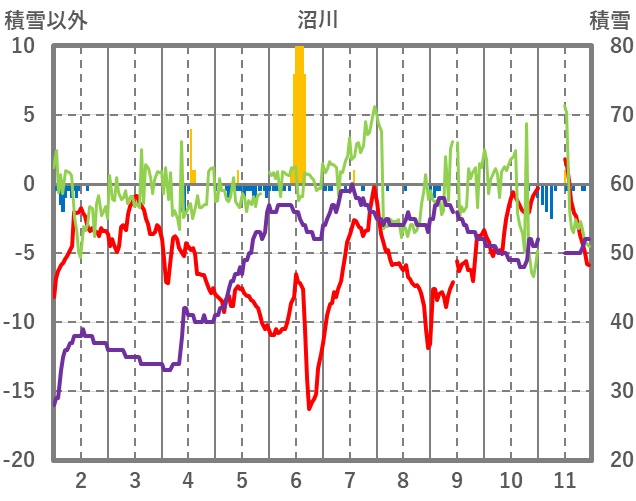 | 日 | 時 | 気温 | 降水 | 風向/風速 | 日照 | 積雪 | 降雪 |