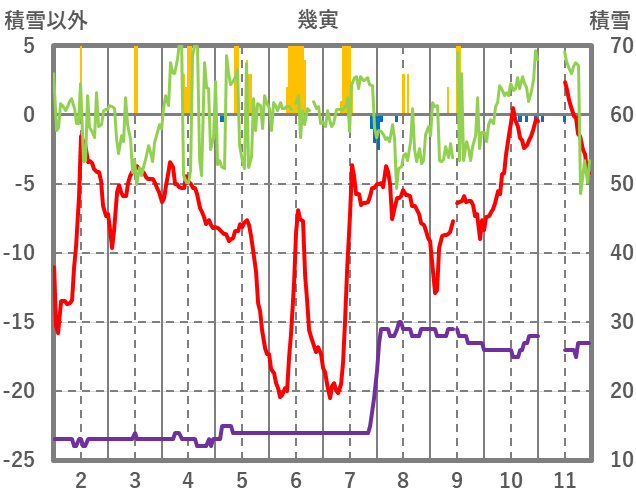 | 日 | 時 | 気温 | 降水 | 風向/風速 | 日照 | 積雪 | 降雪 |