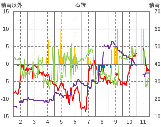 | 日 | 時 | 気温 | 降水 | 風向/風速 | 日照 | 積雪 | 降雪 |