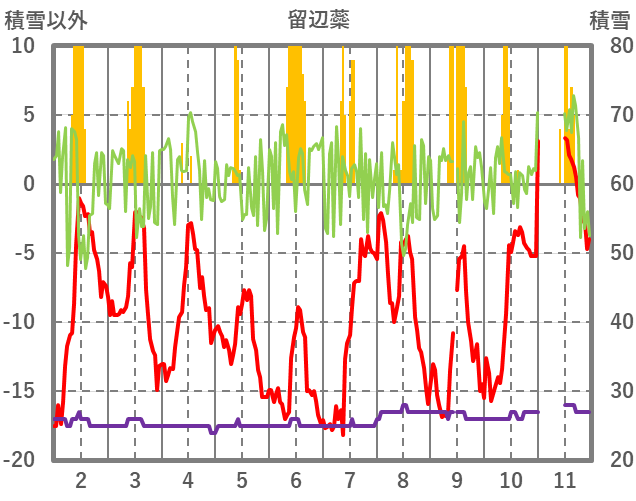 | 日 | 時 | 気温 | 降水 | 風向/風速 | 日照 | 積雪 | 降雪 |
