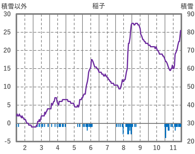| 日 | 時 | 気温 | 降水 | 風向/風速 | 日照 | 積雪 | 降雪 |