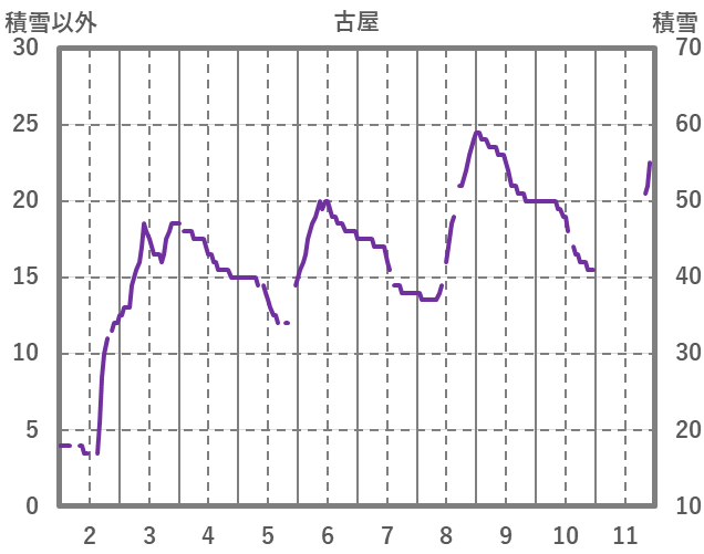 | 日 | 時 | 気温 | 降水 | 風向/風速 | 日照 | 積雪 | 降雪 |