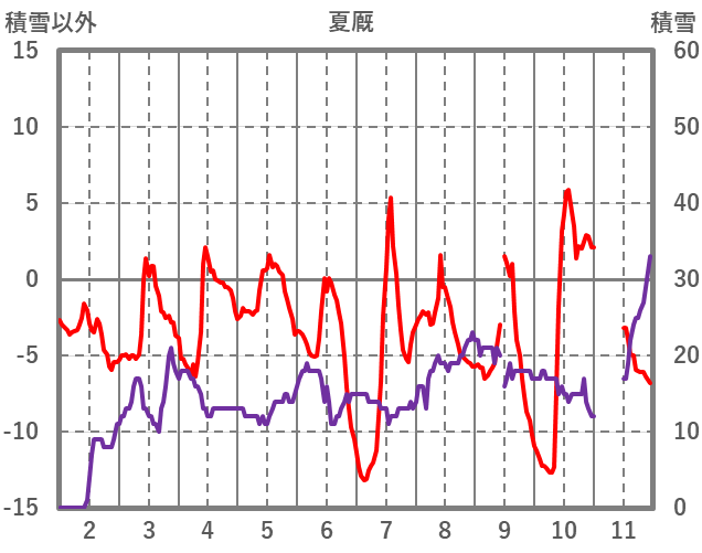 | 日 | 時 | 気温 | 降水 | 風向/風速 | 日照 | 積雪 | 降雪 |