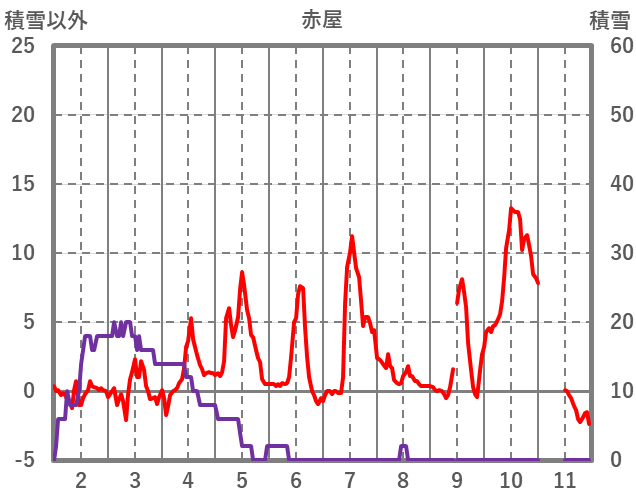 | 日 | 時 | 気温 | 降水 | 風向/風速 | 日照 | 積雪 | 降雪 |