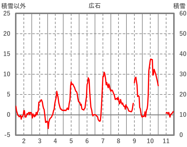 | 日 | 時 | 気温 | 降水 | 風向/風速 | 日照 | 積雪 | 降雪 |