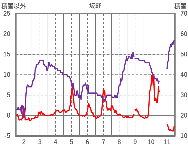 | 日 | 時 | 気温 | 降水 | 風向/風速 | 日照 | 積雪 | 降雪 |