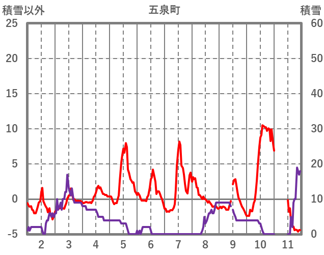 | 日 | 時 | 気温 | 降水 | 風向/風速 | 日照 | 積雪 | 降雪 |