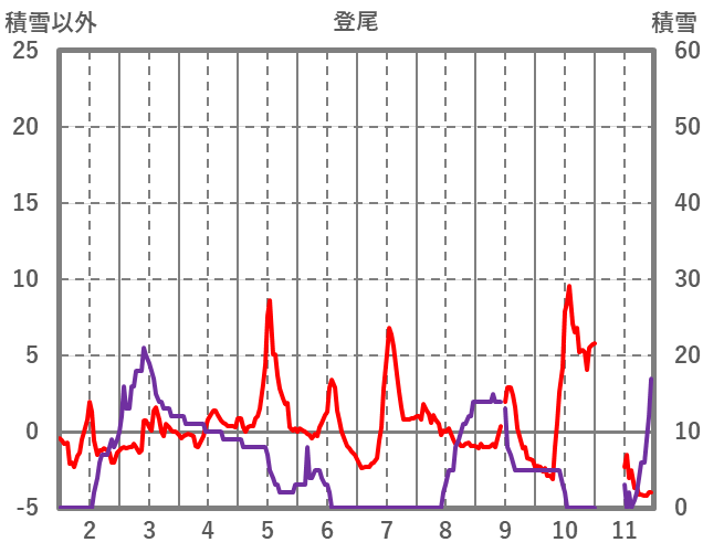 | 日 | 時 | 気温 | 降水 | 風向/風速 | 日照 | 積雪 | 降雪 |