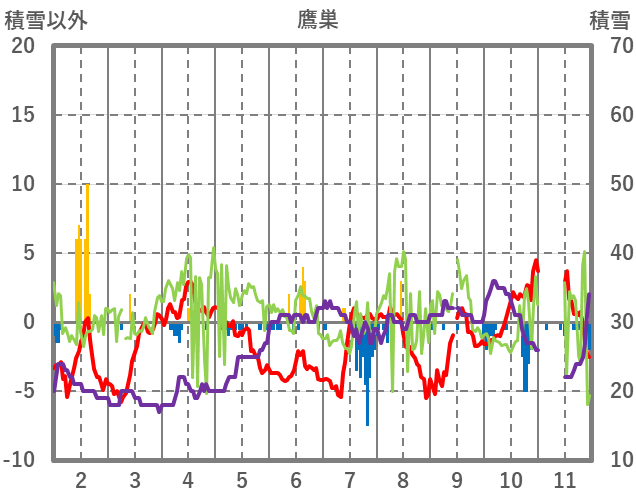 | 日 | 時 | 気温 | 降水 | 風向/風速 | 日照 | 積雪 | 降雪 |