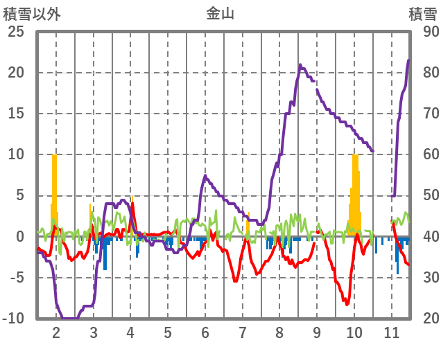 | 日 | 時 | 気温 | 降水 | 風向/風速 | 日照 | 積雪 | 降雪 |