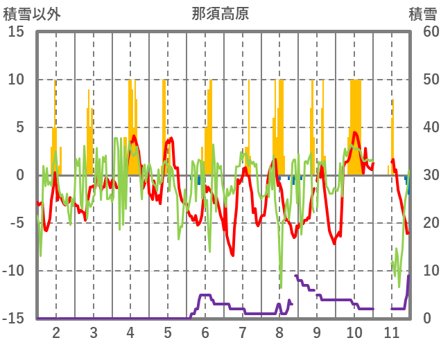 | 日 | 時 | 気温 | 降水 | 風向/風速 | 日照 | 積雪 | 降雪 |