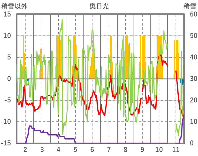 | 日 | 時 | 気温 | 降水 | 風向/風速 | 日照 | 積雪 | 降雪 |