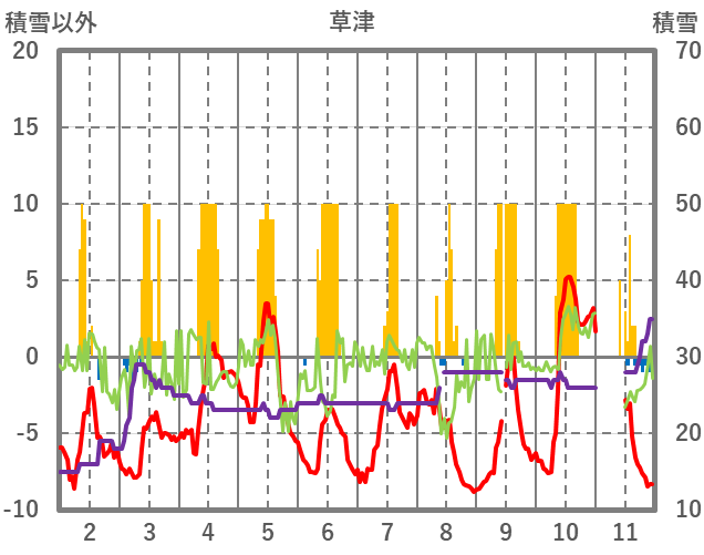 | 日 | 時 | 気温 | 降水 | 風向/風速 | 日照 | 積雪 | 降雪 |