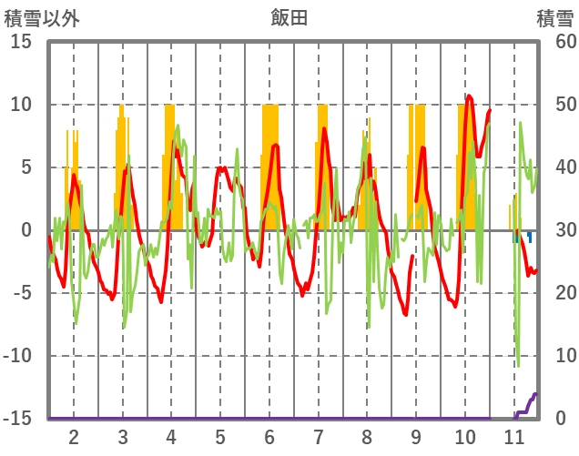 | 日 | 時 | 気温 | 降水 | 風向/風速 | 日照 | 積雪 | 降雪 |