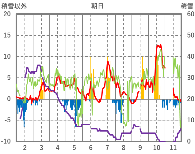 | 日 | 時 | 気温 | 降水 | 風向/風速 | 日照 | 積雪 | 降雪 |