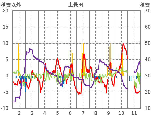 | 日 | 時 | 気温 | 降水 | 風向/風速 | 日照 | 積雪 | 降雪 |