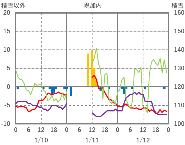 | 日 | 時 | 気温 | 降水 | 風向/風速 | 日照 | 積雪 | 降雪 |