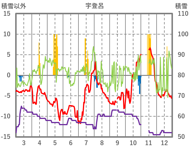 | 日 | 時 | 気温 | 降水 | 風向/風速 | 日照 | 積雪 | 降雪 |