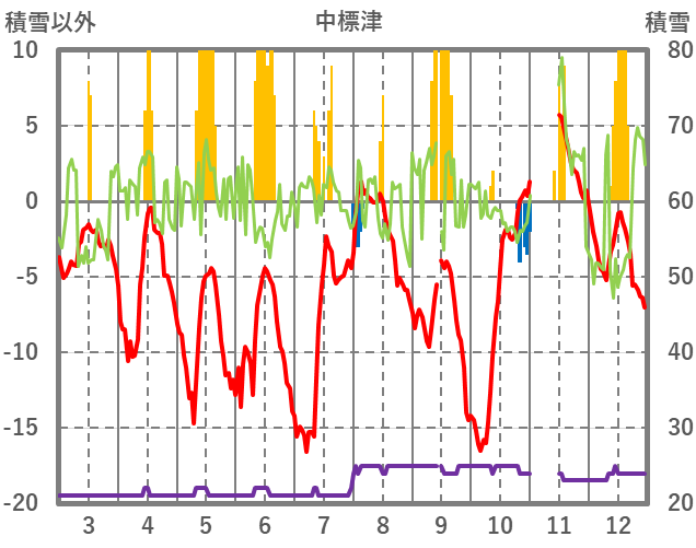 | 日 | 時 | 気温 | 降水 | 風向/風速 | 日照 | 積雪 | 降雪 |